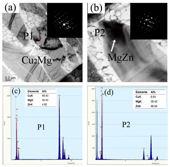 To identify the phases formed in the fused zone in the joint with the Zn interlayer, TEM was performed. Figure 4 shows the bright-field images together with the EDX and SAED patterns. Figure 4a,b shows the newly formed phases (P1 and P2) in the fused zone. According to Figure 4c,d, the phase at P1 shown in Figure 4a contained 68.43 at% Cu, 26.54 at% Mg, and 4.82 at% Zn and that at P2 shown in Figure 4b consisted of 6.64 at% Cu, 39.42 at% Mg, and 46.64 at% Zn. The phases at P1 and P2 corresponded to Cu2Mg and MgZn, respectively, and Zn could react with Mg and inhibit the formation of Mg/Cu compounds.