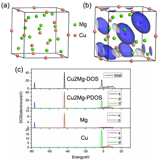 First-principles calculation results of Cu2Mg: (a) Unit cell model; (b) Electron density map; (c) State density maps.