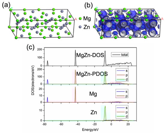 First-principles calculation results of MgZn: (a) Unit cell model; (b) Electron density map; (c) State density maps.