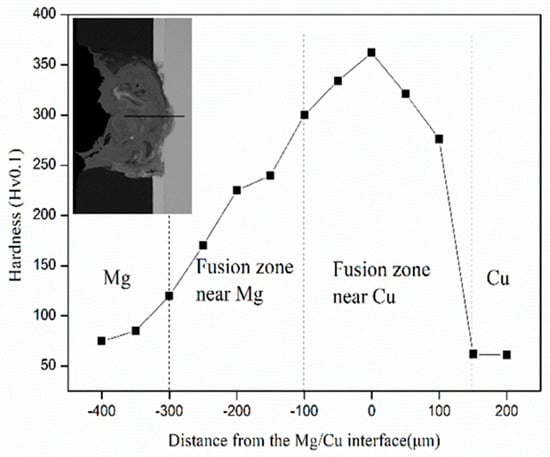 Figure 7 presents the hardness distribution profiles of the Mg/Cu joints. The highest Vickers hardness of the joint was about 360 HV. The Zn interlayer melted in the joints. As could be seen, the hardness of Mg and Cu base metal was 75 HV and 60 HV, respectively. High hardness appeared in the fusion zone near Cu, which was composed of series intermetallics compounds, consistent with Figure 3e. The presence of intermetallic compounds was the main reason for this higher hardness distribution. In the fusion zone near Mg alloy, the average hardness increased to 150–250 HV due to the strengthening effect of the increased Cu content and newly formed Mg–Cu–Zn mixture compositions.