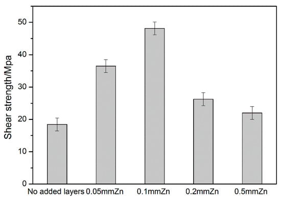The shear strength of the joints is shown in Figure 8. The shear strength of the joint with the 0.1 mm thick Zn interlayer was 48.15 MPa, which was 161% larger than that of the directly welded Mg/Cu joint. When the thickness of the Zn interlayer was increased, the shear strength increased initially but declined afterward. The shear strength of the joint with the 0.5 mm Zn interlayer was 21.98 MPa. The fractures of the different joints are displayed in Figure 9, and Figure 9a,b reveals cracks that reduce the shear strength. As shown in Figure 9c,d, there were torn edges in both joints, and that in Figure 9c was more obvious, indicating that the shear strength of the welded joint with the 0.1 mm Zn interlayer was the highest.