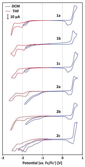 Cyclic voltammetry of 2 × 10−3 M solutions of the studied compounds in DCM/(n-Bu)4NPF6 (blue curves) and THF/(n-Bu)4NPF6 (red curves); scan rate 0.1 V/s.