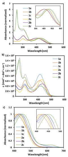 Absorption spectroscopy is a very useful method for the characterization of active species for optoelectronic devices. In order to verify the validity of the theoretical model, the absorption spectra of the examined compounds were initially measured in DCM. The normalized spectra are presented in Figure 4a, and the extracted wavelengths are compiled in Table 3. All the spectra were characterized by a strong ICT band in the visible range, with maxima within 402–434 nm. These values were very accurately predicted, except for compounds 1a and 2a. Unexpectedly, the compounds bearing 1,4-phenylene π-spacer showed ca. 20 nm bathochromic shift compared to the derivatives bearing 1,4-naphthalenylene moiety. The second band, typical of all the compounds, was observed slightly above 300 nm. These bands were also predicted by the DFT method and assigned to π–π* transition of the aromatic moieties, with the difference between the theoretical and experimental data up to 26 nm. The very close maxima of these bands suggest that the latter must originate from a structural motif common to all the compounds, probably the triphenylamine moiety. Finally, a very strong absorption was recorded for compounds 1c and 2c at 256 nm, which is the effect of π–π* transitions characteristic of 1,9-antrhracenylene moiety. It is worth emphasizing that the compounds with the same π-spacer in the structure (1a and 2a, 1b and 2b, 1c and 2c) exhibited almost identical maximum absorption wavelength, so the incorporation of the carboxymethyl group in 2a–c did not result in the meaningful difference. The optical bandgaps were calculated on the basis of the absorption onsets in DCM. All the bandgaps were only slightly varied and ranged from 2.46 to 2.54 eV.
