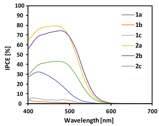 The performance of the fabricated cells was tested under standard AM 1.5G solar irradiation, and the obtained incident photon to current conversion efficiency (IPCE) spectra are presented in Figure 5. In general, the IPCE spectra were broadened relative to the absorption spectra of the dyes deposited on the TiO2 surface. This implies that the devices can convert a broader range of solar radiation into electric energy. The best conversion showed the devices based on 2a and 2b, with IPCE reaching even up to 80%. On the contrary, 1b and 1c based cells were found to be the least efficient, probably due to the poor photovoltaic action of the dyes, as their IPCEs do not resemble the UV-Vis spectra. Interestingly, the compounds bearing 1,4-phenylene spacer exhibited the highest IPCE within the series 1a–c and 2a–c, which must be caused by the most planar geometries of 1a and 2a, as it is favorable for enhanced ICT efficiency. It is noteworthy that the device based on 2b showed almost the same IPCE as 2a, while no similar trend was observed for the 1b and 1a couple. Compounds 1a–c and 2c showed much narrower IPCE action spectra in reference to their absorption spectra on TiO2. In the case of 2c, the reason is that the broad long-wavelength band related to the aggregation is not active in the photoconversion process, whereas, in the case of 1a–c, the poor performance of the cells limited the detection of IPCE above ~530 nm making the impression that the IPCE action spectra are narrower due to the scaling of the chart.