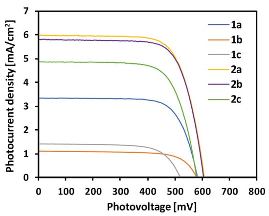 Figure 6 presents the photocurrent density–voltage curves of the DSSCs based on the examined compounds. The plots confirmed the results of the IPCE measurements, proving the best performance of 2a and slightly less of 2b. The parameters of the fabricated devices containing the examined dyes are listed in Table 4. The highest achieved short-circuit photocurrent (JSC) was close to 6 mA/cm2, and the open-circuit voltage (VOC) was close to 600 mV. The worst parameters showed the devices based on 1b and 1c, which generated only up to 1.4 mA/cm2 and were characterized by VOC up to 592 mV. The power conversion efficiencies (PCE) for the latter devices were similar and close to 0.5%, and also the lowest from among the examined dyes. The highest performance in the series 1a–c showed dye 1a, giving almost threefold improvement with regard to the others. Compounds 2a–c showed significantly better photovoltaic performance compared to their counterparts not equipped with a carboxymethyl group. The highest PCE of 2.59% was recorded for dye 2a, and decreased with the extension of the π-aromatic linker size to the value of 2.00% in 2c.