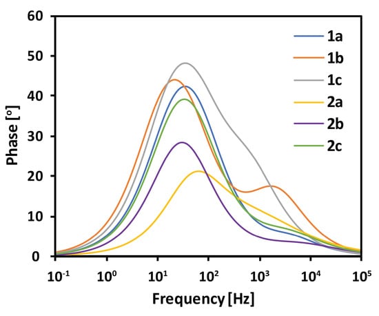The EIS spectra were measured under the standard simulated solar light, at VOC preventing the current flow through the external circuit. Under these conditions, the photogenerated electrons injected into the semiconductor conduction band have to recombine with the electrolyte on the TiO2/dye/electrolyte interface [57,58]. Consequently, the estimated electron lifetime values (τ) may be calculated according to the equation τ = (2πf)−1, using the frequency value at the maximum phase angle (f) from the low-frequency region of the Bode phase plot presented in Figure 8. Longer electron lifetime at the TiO2/dye/electrolyte interface is desired since it implies a more efficient prevention of charge recombination and a more plausible generation of the photocurrent [33,59]. From among the examined dyes, compounds 1b and 2b exhibited the longest τ (see Table 4), while 2a the shortest. In conclusion, the compounds equipped with 1,4-naphthalenylene linker prevented electron recombination most efficiently. Surprisingly, the cell comprising 2a was characterized by the highest PCE and exhibited the shortest τ, while the cell based on 1b showed the lowest PCE and the longest τ. Furthermore, no correlation between VOC and τ was observed, contrary to literature reports [2,33,60]. Interestingly, 2a showed the highest VOC among the tested dyes and the shortest electron lifetime, which is rather unusual. In general, the rise in electron lifetime should imply electron concentration in the semiconductor to be higher, causing an increase in the quasi-Fermi energy level of TiO2. This ought to result in a higher VOC, but it is not always observed [61], as in the case of 2a. Therefore, we came to the conclusion that the electron lifetime was not a determinant for the device performance and the other factors were more important. On the basis of the above studies, we suggest that the best DSSC performance of 2a is mainly attributed to its highest dye loading and the most planar structure facilitating ICT excitation, both factors responsible for the increase in electron density in the semiconductor, while the short τ is not critical for its performance.