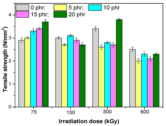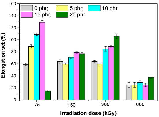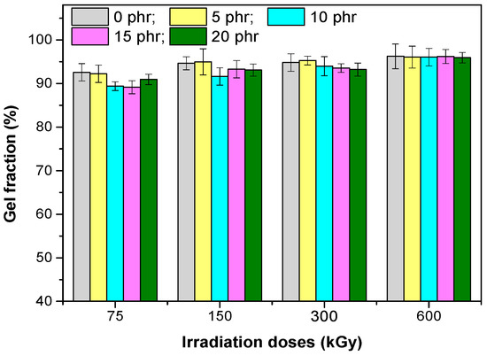 The gel content of the EPDM/hemp fibers composites (Figure 7) increased with increasing irradiation dosage, the highest values were obtained for samples irradiated with 600 kGy. A maximum gel content of 96.22% was obtained for the sample with 15 phr of hemp fibers, irradiated with 600 kGy, and the minimum of 89.16% was obtained for the sample with 15 phr of hemp fibers, irradiated with 75 kGy. The obtained results confirm the tendency of EPDM to crosslink by irradiation [17,19].