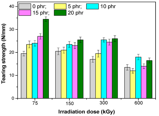 Elongation at breakvalues (Figure 3), for a radiation dose of 75 kGy, increase with the increased amount of fibers introduced, due to the strong rubber–filler interaction that occurred in the system. For the mix with 20 phr hemp fibers, a smaller value is observed for elongation at break. Given that for this sample the best values of hardness, tensile and tear strength were obtained, it can be assumed that this value of the elongation at break would be due to the enhancement in rigidity of the composites [34] or a weaker rubber–fiber interaction. Upon increase of the irradiation dose, the value of the elongation at break decreased, as a result of the increase of the degree of crosslinking that limits the movement of the macromolecular chains.