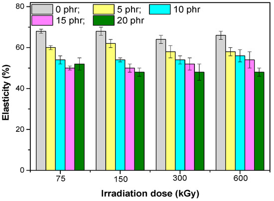Elasticity versus electron beam irradiation dose and the amount of hemp fibers.