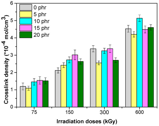 In Figure 8 the crosslink density values are shown, determined using the Flory–Rehner equation. For the analyzed samples, an increase of the crosslinking density occurred with the increase of the EB dose, but when thehemp fiber content increased, an uneven variation of the crosslinking density was observed. These results were due, in the first place, to the reactions that occur through irradiation, namely: (1) the crosslinking reactions that occurred especially in the elastomeric matrix of EPDM, (2) the degradation reactions that occurred especially in the hemp fibers and which could lead to scission of the main chain and the formation of radicals, which may initiate grafting, crosslinking reactions, or obtaining aldehydes, and carboxylic acids [36] and (3) grafting and recombination reactions, which can lead to the improvement of rubber–fibers interactions, as well as the structural changes of the samples [17,19,23].