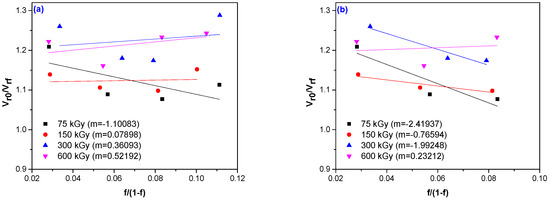 In order to determine rubber–fiber interactions, the Kraus equation was used from swelling time [28,29]. The ratio Vro/Vrf, and the values Vrf are listed in Table 4. The fiber polymer interaction parameter (m) was determined by graphically representing the Kraus equation (see relation 6) and the obtained values are shown in Figure 10, where in the option a theparameter m was determined for all four hemp fiber concentrations, and in option b, the parameter m wasdetermined only for the first three concentrations of fibers, removing the 20 phr hemp fibers sample. According to Kraus theory [28], the negative values of the parameter m, suggesting an improved interfacial interaction. For the first option, negative values were obtained only for the samples irradiated with 75 kGy, on the other hand, if only the samples with 5 phr, 10 phr and 15 phr hemp fibers were analyzed, negative values of the parameter m were obtained for irradiation doses of 75 kGy, 150 kGy and 300 kGy, respectively. In conclusion, for samples with a concentration of hemp fiber of max 15 phr irradiated with 75–300 kGy, as well as for mixtures with 20 phr hemp fiber irradiated with 75 kGy, very good values of the rubber–fiber interaction were obtained. These experimental data indicate that the new method of improving rubber–fiber interaction by accelerated electron irradiation leads to great results.