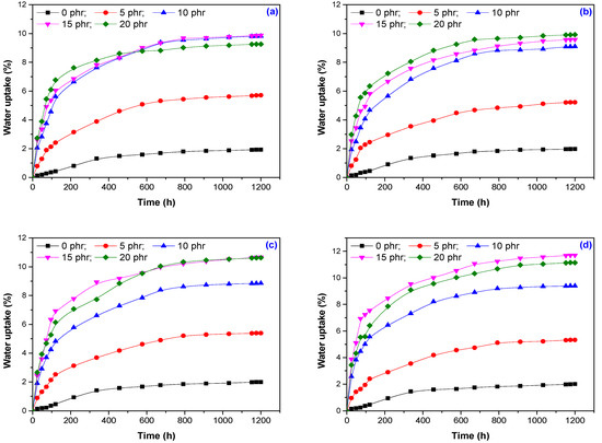Water uptake of composites based on EPDM and hemp fiber versus immersion time for irradiation doses of (a) 75 kGy; (b) 150 kGy; (c) 300 kGy and (d) 600 kGy.