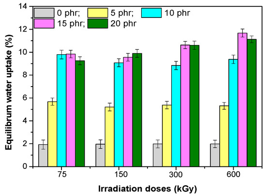 The water uptake results obtained for the EPDM-based composites and hemp fibers are shown in Figure 11. The percentage of water absorption in these samples depends on both the hemp fibers content and the irradiation dose. The water uptake for all samples was faster during the first 600 h (h) and continued to increase progressively, when finally, a plateau was observed, showing that the water absorption reached equilibrium (Figure 12). For composites containing 5 phr and 10 phr hemp fibers, a significant increase in water absorption was observed (approximately 3, respectively 5 times compared to the control sample), but the further increase of the amount of hemp fibers in mixtures, the changes that take place in the value of water absorption are uneven. The increase of water absorption is due to the hydrophilic nature of the hemp fiber, which increased the absorption capacity of the water by forming hydrogen bonds between the water and the cellulose and hemicellulose -OH groups. Thus, with the increase of the hemp content in the composite, the number of hydrogen bonds between the organic components and the water molecules also increased. Higher hemp content led to larger gaps that led to water accumulation at the interface between the fiber and matrix [39,40]. The degree of water absorption depends on the availability of –OH groups on the fiber surface. In composites with a high degree of compatibilization, the number of –OH groups was reduced by the irradiation process (observed at 75, 150 and 300 kGy) and thus the water absorption was restricted. Moreover, the gaps in the composites with a higher degree of compatibility were reduced due to the improved adherence to the interface between the fiber and the matrix, which has limited the penetration of water molecules into composites [39].When increasing the dose of irradiation, a slight increase in the equilibrium value of the water absorption was observed for the doses of 300 and 600 kGy only for mixtures containing 15 phr and 20 phr, respectively. This can be determined by the changes in the structure of the composites by irradiation at high doses, which led to both the modification of the sample surface and the fiber–rubber interface.