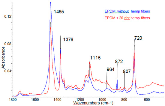 The infrared spectra for EPDM samples without hemp fibers and with 20 phr hemp fibers, irradiated with 150 kGy.