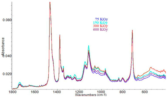 For evaluating the structural modification due to processing by the irradiation of the samples, analysis of the spectral FT-IR of the samples was carried out. Figure 13 and Figure 14 present the infrared spectra obtained in the range of 1800–450 cm−1 of the blends irradiated, without fiber hemp and 20 phr of fiber hemp.