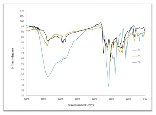 The FTIR of the prepared HB(PDMA)s G2, G3, and G4 (see Figure 2) detected the appearance of peaks at 1648 cm−1 and 1557 cm−1, which can be attributed to –CONH; a broad peak at 3200–3600 cm−1 assigned to the primary and secondary amine; a strong band at 3000–2849 cm−1 for the CH alkanes; and bands at 1124 cm−1 and 1173 cm−1assigned to the –C–N– stretches [34].