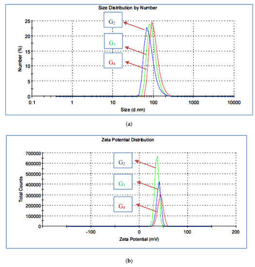 The structure of a macromolecule can be widely studied by particle size and zeta potential [36]. The particle size distribution of the prepared HB(PDMA)s was measured by DLS and is illustrated in Figure 4a. The highly diluted solution of HB(PDMA) samples were dispersed in methanol, then in 2% diluted-distilled water with 0.01% HCl to protonate the terminal amine groups [29]. We could observe the particle sizes of HB(PDMA)s at.81.98, 93.86, and 107.1 nm of G2, G3, and G4, respectively. The branching number was increased by increasing the particle size. The zeta potential data are as shown in Figure 4b. was increased with increasing the number of branching leading to increasing the number of terminal amine groups as 35.8, 39.8, and 43.5 for HB(PDMA)G2, G3, and G4, respectively.