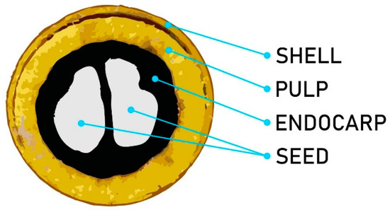The Acrocomia aculeata (Jacq.) Lodd fruit, also known as bocaiúva, coco-babassu, coco-de-espinho, macaíba, macaibeira, and macaúba, comes from a palm found in many regions of the Americas. These palms are distributed mainly in the Cerrado and Pantanal biomes. In Brazil, the Acrocomia aculeata endocarp (AE) fruit is the leading commercial product of the palm. It has been employed in biodiesel and animal feed, among other food products. The fruit consists of pulp (mesocarp), fibrous material with a sweet flavor, endocarp firmly attached to the pulp, and nut (Figure 1) [9].