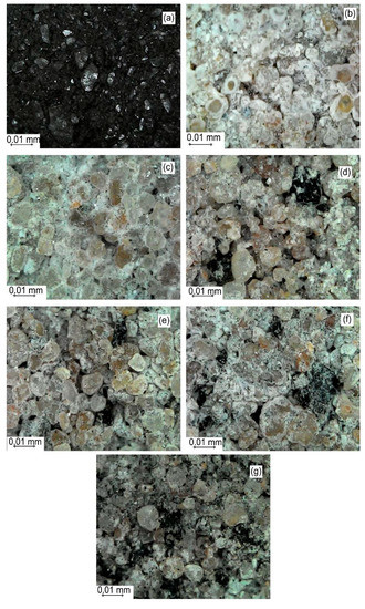 Figure 2 shows the typical morphology of the thermal treated AE and PC/AE composites. The AE particles exhibited a dark appearance as a result of the treatment at 250 °C. The surface of PC/AE bricks with 0, 5, 10, 15, 20, and 50 wt% AE revealed PC-soil clusters with a diameter of about 10 µm. The soil particles in the sample without AE were surrounded only by Portland cement (Figure 2b). In its turn, the soil particles were less surrounded by PC with the AE addition in the matrix. Besides, the regions occupied by AE particles were still moist even long after the bricks were removed from water due to the AE ability to absorb moisture [9].