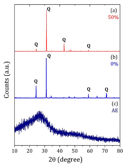 The X-ray diffraction pattern of the AE and PC/AE composites are exhibited in Figure 3. The AE powder showed no crystalline phases after thermal treatment, with a characteristic large amorphous halo at approximately 27°. The PC and PC/AE bricks with 50 wt% AE presented a crystallographic phase related to SiO2 (Quartz) with small differences in the relative peak intensities [21]. Increasing the AE particles in the PC/AE composite did not substantially affect the crystallographic characteristics of the matrix.