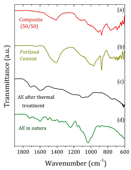Infrared spectra of the (a) PC/AE composite with 50 wt% AE and (b) PC sample, both after 28 d of cure, (c) AE particles after thermal treatment at 250 °C, and (d) AE in natura.