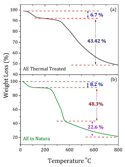 Thermogravimetric (TG) curve of the (a) thermal treated and (b) untreated AE.