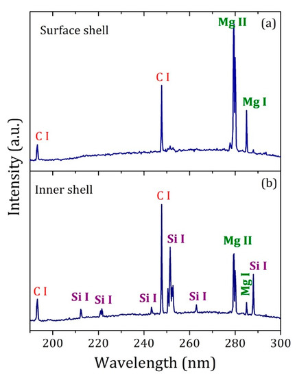 The LIBS analysis confirmed the hypothesis of the presence of carbon and inorganic elements in the AE sample in natura (Figure 6). The elements C and Mg were identified as the main constituents of the surface of the AE (surface shell), while the Si element was detected in the inner shell along with C and Mg.