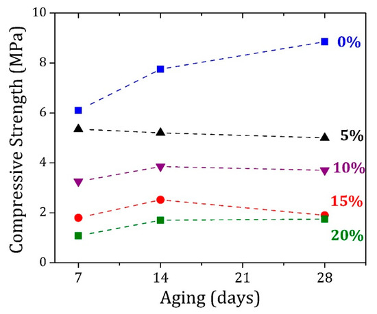 The compressive strength values of the PC and PC/AE bricks in different cure times are highlighted in Table 2 and displayed in Figure 7. The mechanical resistance of the bricks decreased as a function of the amount of AE in the composite matrix. Once the Portland cement is mainly responsible for the mechanical strength of the bricks acting as a binder, the substitution of PC by AE promotes a minor percolation of the PC in the matrix, modifying the mechanical properties of the brick. The usual behavior of compressive strength for pure PC brick is shown in Figure 7. The value of compressive strength was enhanced by about 45% from 7 to 28 d of curing due to the calcium-silicate phase formation during this period. This value should grow four times longer than 28 d. The rising tendency with curing time was observed only for the sample with 20 wt% AE, in which the compressive strength increased around 62% in the same period. On the other hand, the sample with 5 wt% AE showed the opposite behavior, with compressive strength decreasing 6% between 7 and 28 d of curing. Although the samples with 10 and 15 wt% AE exhibited an improvement of 14 and 5%, respectively, in the compressive strength during the entire period, a decrease of 4 and 25% was observed from 14 to 28 d of curing, respectively. An experimental deviation due to the standard procedure recommended by NBR 8492 cannot be ruled out because it is based on an average value from two samples, which could be affected, e.g., by the molding before insertion of the sample in the mechanical press or intrinsic differences among the samples related to the manufacturing.