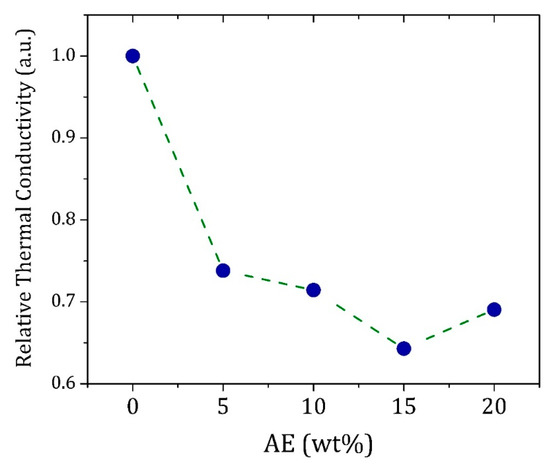 The thermal conductivity of the composites was determined, considering the PC brick as reference (Figure 8). The composite with 5 wt% AE presented a thermal conductivity 25% lower than one verified in the PC material, but the higher reduction (37%) was confirmed for the composite with 15 wt% AE. The significant changes in the thermal conductivity should be associated with the AE clusters dispersed in the matrix, which act as heat absorption sites due to their intrinsic high heat capacity.