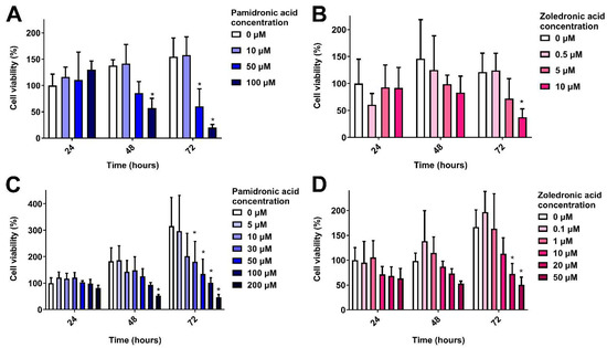 Cell metabolic activity over 72 h in the presence of bisphosphonates measured by MTT assay. (A) Human oral fibroblasts with pamidronic acid, (B) human oral fibroblasts with zoledronic acid, (C) immortalised human oral keratinocytes with pamidronic acid and (D) immortalised human oral keratinocytes with zoledronic acid. Values normalised to 0 µM at 24 h. One significant outlying value removed. N = 3, n = 3. Error bars = standard deviation (SD). Significance against 0 µM at each time point indicated by * p ≤ 0.05.