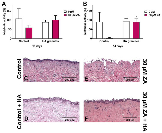Figure 5A shows the metabolic activity of oral mucosa models treated with ZA, with and without HA granules, after 10 days in culture. Metabolic activity values were normalised to day 7 values (before BP and HA treatment). As expected, treatment of the models with 30 µM ZA but without HA reduced the metabolic activity by approximately 50%. However, the models cultured with both ZA and HA had a metabolic activity close to 100%.