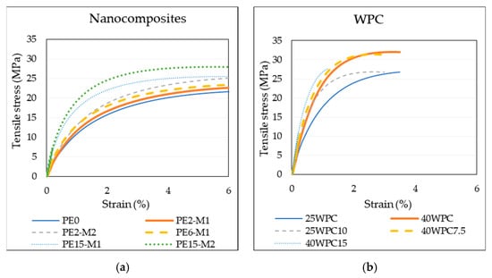 Tensile stress–strain curves of (a) nanocomposites, and (b) wood polymer composites. Colored version of the graphs can be found online.