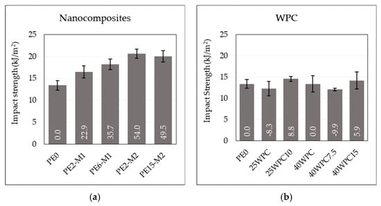 Impact strength of (a) the nanocomposites, and (b) the wood polymer composite at different graphene and wood fiber loadings. Data labels represent the percentage change with respect to neat polymer.