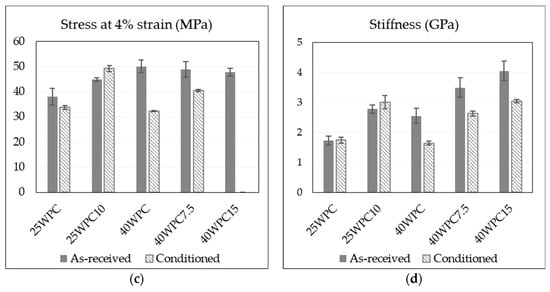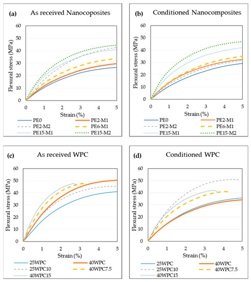 Effect of moisture on the flexural properties of the materials: (a,b) flexural stress and stiffness for the nanocomposites; (c,d) flexural stress and stiffness of WPCs. Sample 40WPC15 broke at average strains below 4% (3.47%) registering an average maximum stress of 41.7 MPa.