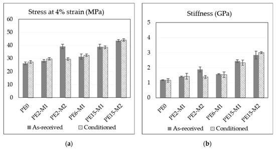 Flexural properties of WPC with moisture effect. The values 4% of strain and 25 MPa stress in subscript are selected as a common value to facilitate comparison between all samples.