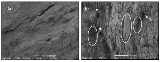 SEM images of the impact fracture surface of: (a) 40 WPC; and (b) 40WPC7.5.