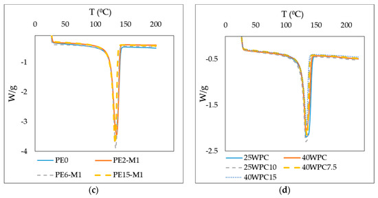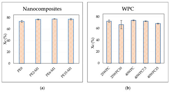 The degree of crystallinity is shown in Figure 8 for the nanocomposites and WPC at different GNPs and wood content. From Figure 8a, no significant difference in the case of nanocomposites is found. Some difference in crystallinity with the addition of wood reinforcement is observed (Figure 8b). This indicates that crystallinity is higher with higher wood content and it is reduced with the addition of nano-reinforcement (for the same content of wood). This is also visible in the shape of the melting peaks presented in Figure 8c,d, where the peaks of the WPC are smaller but also rather wider than those of the nanocomposites (full thermograms can be found in Figures S3 and S4). The reason can be attributed to the significant increase in the viscosity of the polymer at such high content of reinforcements, which can restrict the movement of the polymer chains obstructing them from diffusion to the crystal nuclei [33]. However, the experimental scatter is rather high, and more specimens have to be tested to exclude possible influence of material inhomogeneity. Therefore, no solid conclusions concerning the influence of reinforcement on crystallinity of matrix are made at this point.