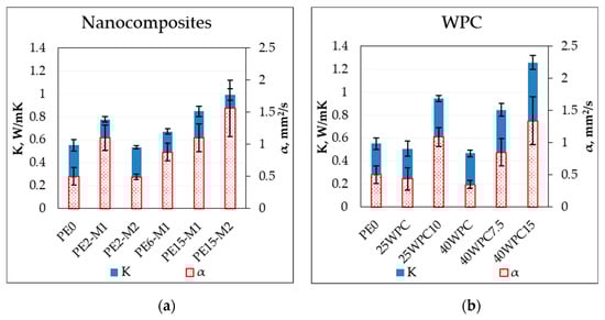 Thermal conductivity and diffusivity of (a) the nanocomposites; and (b) the wood polymer composite.