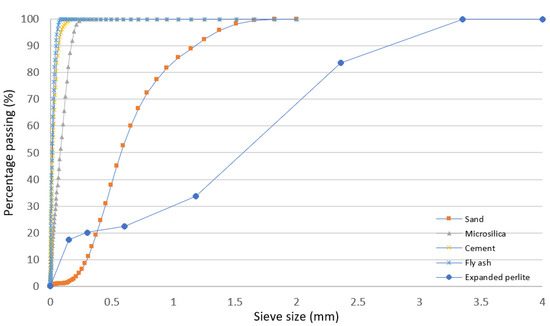 Particle size grading of the sand, cement, fly ash, and microsilica was conducted using a laser diffraction analyzer (LS 13 320, Beckman Coulter, Indianapolis, IN, USA). However, due to the large size of the EP aggregate (>2 mm), sieve analysis was implemented as per the ASTM C136/C136M-19 standard. Figure 1 illustrates the grading curves of all materials used in this work as a function of sieve aperture.