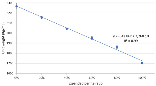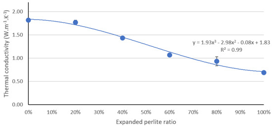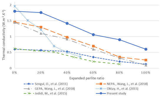 In a previous study [18], the effects of varying the pumice aggregate-to-cement ratio within low-strength concrete were evaluated. The author reported that pumice concrete with a maximum ratio of 25:1 aggregate to cement is suitable for use as load-bearing blocks, although higher ratios are inadequate for industrial use in terms of strength and thermal conductivity. The effect of waste rubber incorporation in concrete was also analyzed in [19] and was found to decrease the thermal conductivity only slightly. Moreover, aerogel-incorporated mortar was evaluated for enhancing the thermal property of concrete [14]. It was found that a 50% volumetric incorporation of aerogel in a concrete mixture decreased the thermal conductivity only 0.55 W·m−1·K−1 but significantly decreased the compressive strength to 20 MPa. In an attempt to rectify such tradeoffs, significant research has been dedicated to investigating the use of perlite and expanded perlite (EP) material in concrete.