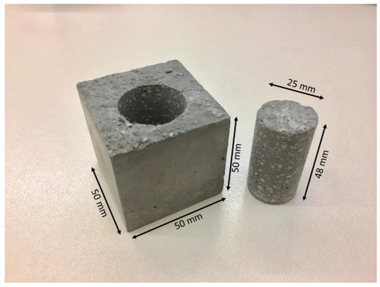 Fifteen samples were taken from each of the six mixtures for testing purposes. Twelve of these cubic samples, with dimensions of 50 × 50 × 50 mm, were used to test the compressive strength at different time intervals of 1, 7, 28, and 56 days. To evaluate the flexural strength, three beam specimens with dimensions of 40 × 40 × 160 mm were prepared and tested on day 28. Fragments that developed during the flexural strength testing were used for thermal conductivity analysis. One of the three remaining samples from the original 15 for mixtures 1, 4, and 6 was used for microstructural analysis using X-ray CT imaging. The samples were cored from the center of each 50 mm3 cube, resulting in a ~25.4 mm ø cylindrical sample with a length of ~50mm, as illustrated in Figure 3. CT imaging enabled enhanced analysis of the mixtures, and in particularly, for evaluating the internal structure of the material.