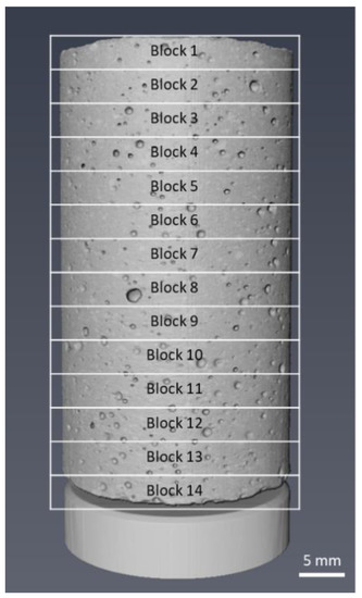 Microstructural analysis of the CT scans was performed using Thermo-Fisher Avizo Fire (Thermo-Fisher Scientific, Waltham, MA, USA) image analysis suite. In order to study the effect of EP addition in the concrete mixture upon concrete microstructure, the volume fractions of the cementitious material paste, air voids, and EP were measured. To reduce computational overhead, each concrete sample volume separated into 14 sub-volumes, each consisting of ~160 orthoslices (Figure 5).