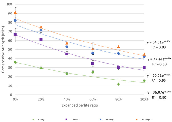 Despite this decrease in compressive strength, the resulting measurements are still acceptable and are comparable to the strengths of structural concrete mixtures. Figure 6 also shows relatively high coefficient of determination (R2) values, which indicate good exponential fitting to the data points. The error bars in the graph represent the standard deviation between the results for each reported average.