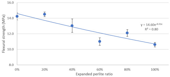 Figure 7 shows the flexural strength measurements for the six mixtures when tested on day 28. Similar to compressive strength data in Figure 6, an exponential function was used to fit the flexural strength data and it yielded an R2 of 0.80. The flexural strength of the concrete decreased from 14.2 MPa at 0% EP in the mixture to 10.6 MPa when 100% of the sand was replaced by EP.