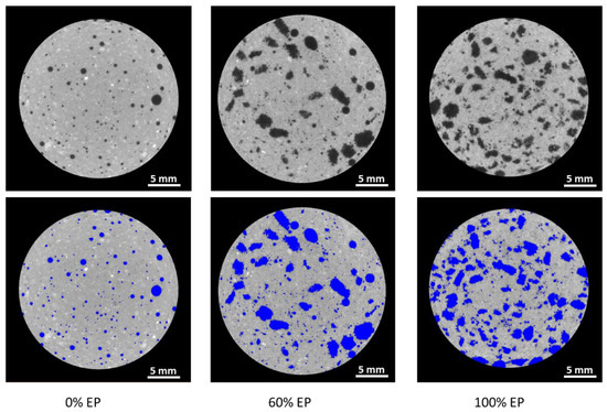 Lightweight concrete may experience segregation between the aggregate and the paste material [17,40,41], thus resulting in non-homogenous concrete exhibiting undesirable qualities. 3D volume renderings of the samples for 0%, 60%, and 100% EP are shown in Figure 10. No material segregation between the EP aggregate and the paste material was evident within the samples, thus verifying the crucial homogeneity throughout the imaged volume.