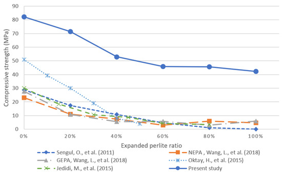 The work in [24] investigated the use of EP filled with aerogel as a replacement for typical aggregate in concrete. In particular, the authors conducted an experimental study using graded EP filled with aerogel (GEPA) and non-graded perlite filled with aerogel (NEPA). The experiments were conducted with different volumetric replacement amounts of typical aggregate from 0% to 100% replacement in increments of 20%. The experimental study in [29] investigates a new cement-based material by incorporating various amounts of EP to replace the normal aggregate. Finally, the work in [30] evaluated the effect of EP on lightweight concrete at a W/C ratio of 0.7. Figure 12 shows that the proposed material outperformed all other studied materials in terms of compressive strength. In addition, the mixtures proposed in the present study have slightly higher thermal conductivities than those in the literature as shown in Figure 13, which can be attributed to differences in the unit weight and measurement method [42]. The proposed mixture obtained superior strength in comparison with previous studies due to introducing perlite to a reference/control mix that had compressive strength of 82.17 MPa at 28 days. This strength was achieved primarily by using different admixtures and a low w/c ratio. As a result, the high strength and low thermal conductivity makes this material appropriate for use in structural elements such as bearing walls, roof slabs and columns, while achieving improved insulation than conventional structural concretes.
