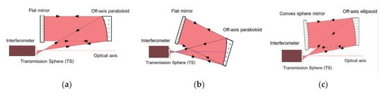 Schematic diagram of auto-collimation: (a) off-axis paraboloid located at off-axis; (b) off-axis paraboloid located at on-axis; (c) off-axis ellipsoid located at off-axis.