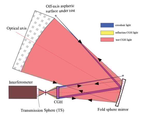 The CGH includes three parts: the test CGH, reflection CGH, and crosshair CGH. The test CGH is the transmission diffraction part (the red part in Figure 2), which creates the same wavefront of the off-axis aspheric surface under testing. When the off-axis aspheric surface is different, the corresponding CGH varies according to the customized design. Reflection CGH is used to align the interferometer and CGH (the yellow part in Figure 2), and crosshair CGH is applied to align the CGH and off-axis aspheric under testing (the blue part in Figure 2).