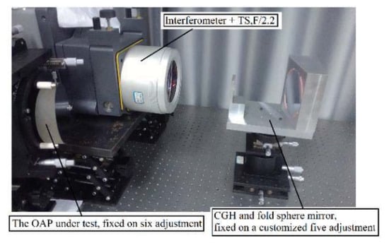 During the measuring process, the customized CGH was placed close to the fold sphere mirror by a customized fixture, with which the relative position between the CGH and fold sphere could be guaranteed, as presented in Figure 11. At the same time, the customized fixture was mounted on a five-dimensional adjuster so that they would be regarded as the whole during the adjusting process. After repeatedly adjusting, the position error of each element can be reduced to a negligible value. Meanwhile, the errors of the fold sphere mirror and CGH were far less than the error of OAP, so the testing result can be regarded as the shape error distribution of the OAP.