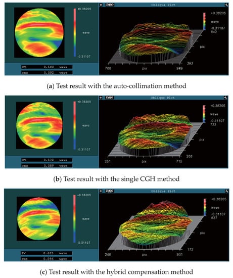 This OAP was measured using three methods, respectively. After the measured data were simply processed in MetroPro software (V9.1.1) [21] to remove piston, tilt, and power, the experimental results were obtained and are shown in Figure 12.